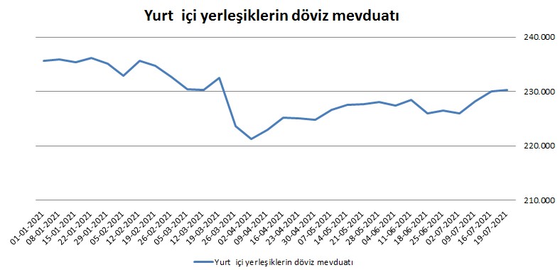 Türkiye Cumhuriyet Merkez Bankası(TCMB) tarafından açıklanan verilere göre, bir önceki hafta 229 milyar 999,60 milyon dolar olan yurt içi yerleşiklerin döviz mevduatı 19 Temmuz ile sona eren haftada 230 milyar 314,60 milyon dolara geldi.