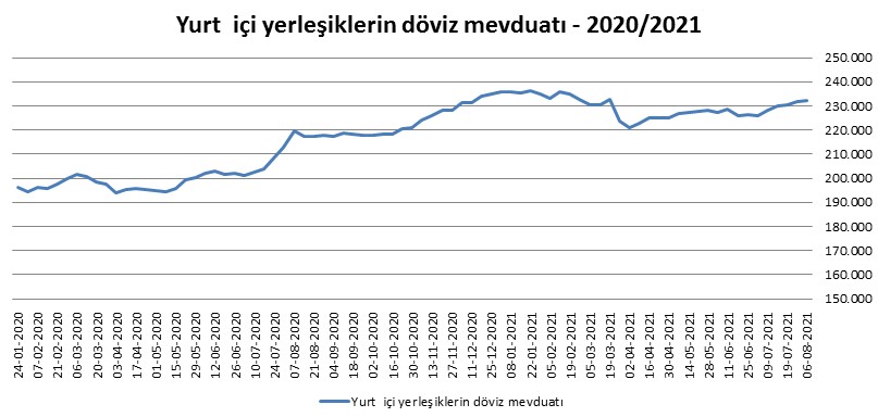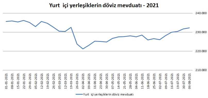 Türkiye Cumhuriyet Merkez Bankası(TCMB) tarafından açıklanan verilere göre, bir önceki hafta 231 milyar 646,70 milyon dolar olan yurt içi yerleşiklerin döviz mevduatı 6 Ağustos ile sona eren haftada 587,6 milyon dolar artışla 232 milyar 234,3 milyon dolara geldi.