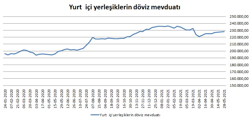 Türkiye Cumhuriyet Merkez Bankası(TCMB) tarafından açıklanan verilere göre, bir önceki hafta 227 milyar 685,0 milyon dolar olan yurt içi yerleşiklerin döviz mevduatı 28 Mayıs ile sona eren haftada 228 milyar 39,3 milyon dolara geldi.