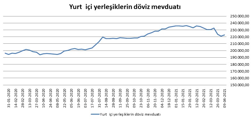 Türkiye Cumhuriyet Merkez Bankası (TCMB) tarafından açıklanan verilere göre, bir önceki hafta 221 milyar 201,1 milyon dolar olan yurt içi yerleşiklerin döviz mevduatı 9 Nisan ile sona eren haftada