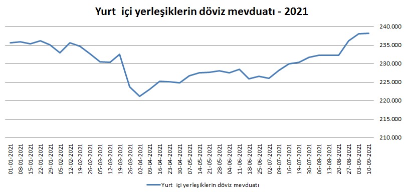Türkiye Cumhuriyet Merkez Bankası(TCMB) tarafından açıklanan verilere göre, bir önceki hafta 238 milyar 118,5 milyon dolar olan yurt içi yerleşiklerin döviz mevduatı 10 Eylül ile sona eren haftada 238 milyar 122 milyon dolara geldi.