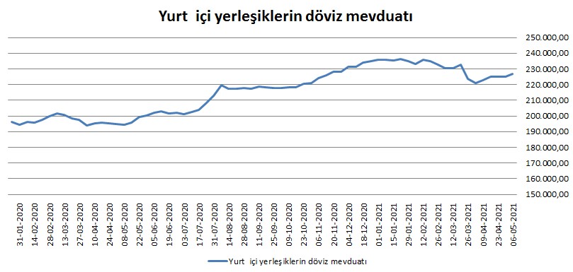 Türkiye Cumhuriyet Merkez Bankası(TCMB) tarafından açıklanan verilere göre, bir önceki hafta 224 milyar 827,3 milyon dolar olan yurt içi yerleşiklerin döviz mevduatı 7 Mayıs ile sona eren haftada 226 milyar 631,7 milyon dolara geldi.