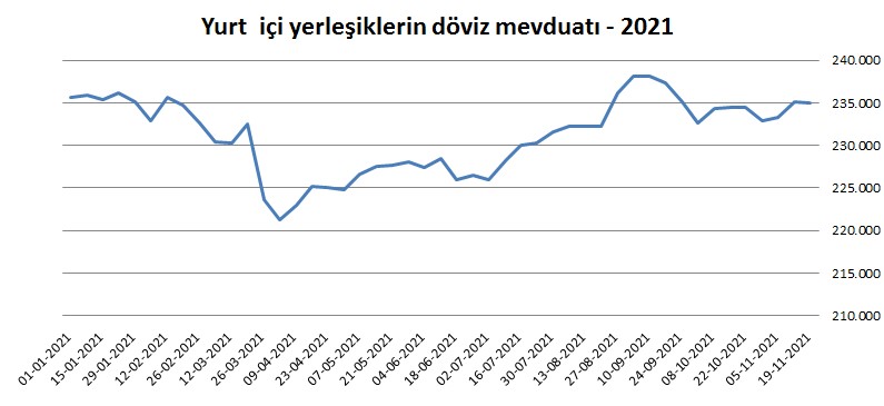 Türkiye Cumhuriyet Merkez Bankası(TCMB) tarafından açıklanan verilere göre, bir önceki hafta 235 milyar 167 milyon dolar olan yurt içi yerleşiklerin döviz mevduatı 19 Kasım ile sona eren haftada 235 milyar 40 milyon dolara geldi.