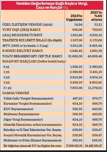 3 Kasım’da belli olacak yeniden değerleme oranına göre yılbaşında artırılacak vergi, ceza, harç, ücret ve tarifeler şunlar:
