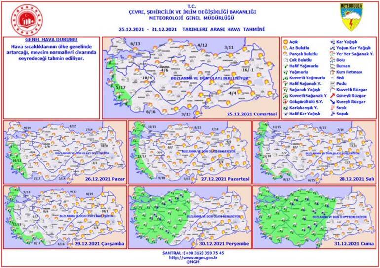 Meteoroloji Genel Müdürlüğü'nde yapılan açıklamada 25 Aralık ile 31 Aralık tarihleri arasında, "Hava sıcaklıklarının ülkemiz genelinde artacağı, mevsim normalleri civarında seyredeceği tahmin ediliyor." ifadeleri yer aldı.