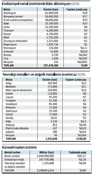 British Geography Survey verilerine göre, 2019 yılında tam 3 milyar tonun üzerinde demir cevheri üretimi yapıldı. Bu, tüm dünyada çıkarılan toplam metal madenlerin yüzde 93.57’sini oluşturdu. Demir cevherinin ana kullanım alanı çelik üretimi ve cevherin yüzde 98’i çelik fabrikalarına gidiyor. Madenlerden elde edilen endüstriyel metal büyüklüğü 207.5 milyon ton ile toplam içinde yüzde 6.3 paya sahip. Teknolojide kullanılan metaller ve değerli metal madenciliği ise 1.33 milyon ton ile toplam üretimin yüzde 4’üne denk geliyor.