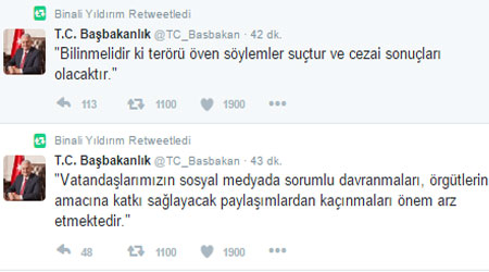 Başbakan Binali Yıldırım, "Vatandaşlarımızın sosyal medyada sorumlu davranmaları, örgütlerin amacına katkı sağlayacak paylaşımlardan kaçınmaları önem arz etmektedir." değerlendirmesinde bulundu.