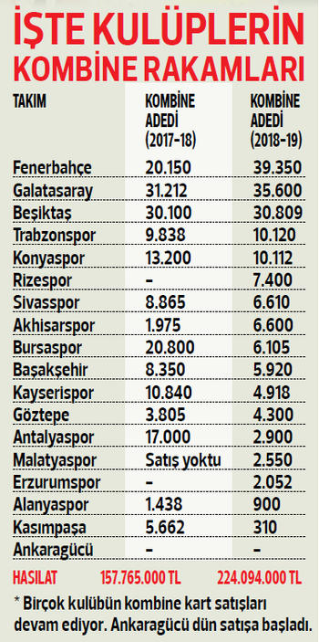 Kombine satışlarında beklentilerin altında kalan takımların başında ise Antalyaspor geliyor. Mali sıkıntılar içerisindeki kulüp bir önceki sezon toplamda 17 bin adet bilet satışı gerçekleştirmişti. Ancak kulüp bu sezon sadece 2 bin 900 adet kombine kart satabildi. Sivasspor ve Alanyaspor bir önceki sezonun kombine sayısını yakalamak üzere. (Hürriyet / Ceyhun Kuburlu)