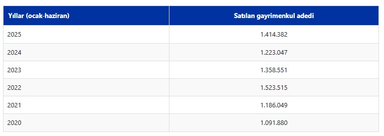 2020-2025 yılları ocak-haziran dönemleri dikkate alındığında ülke genelinde satılan gayrimenkul adetleri şu şekilde:
