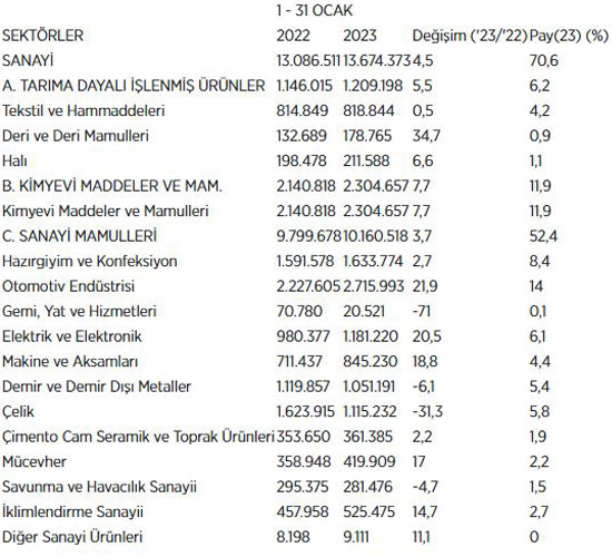 TİM verilerine göre, bu yıl ve 2022'nin ocak döneminde sanayi grubu ve sanayiye bağlı sektörlerin ihracatı şöyle: