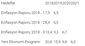 Özellikle döviz kurunda oynaklığın arttığı ağustos ayı sonrasında enflasyondaki gelişmeler piyasaların odak noktasına yerleşirken, Hazine ve Maliye Bakanı Berat Albayrak tarafından 20 Eylül'de açıklanan Yeni Ekonomi Programı'nda (YEP) enflasyon tahminleri 2018 için yüzde 20,8, 2019 için yüzde 15,9, 2020 için yüzde 9,8 ve 2021 için yüzde 6,0 olarak yer aldı.