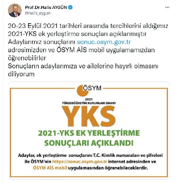 ÖSYM Başkanı Aygün, Twitter'daki hesabından yaptığı açıklamada, "20-23 Eylül 2021 tarihleri arasında tercihlerini aldığımız 2021-YKS ek yerleştirme sonuçları açıklanmıştır. Adaylarımız sonuçlarını 'http://sonuc.osym.gov.tr' adresimizden ve ÖSYM AİS mobil uygulamamızdan öğrenebilirler. Sonuçların adaylarımıza ve ailelerine hayırlı olmasını diliyorum" dedi.