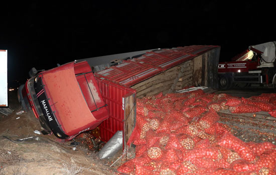 Afyonkarahisar’ın Sandıklı ilçesinde TIR’la çarpışan kamyon devrilirken, kasasındaki soğan çuvalları yola saçıldı. Kazada 1'i Makedon 2 şoför yaralandı.