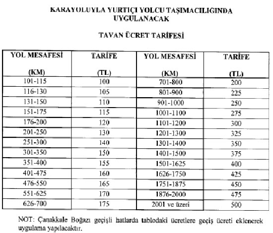 Buna göre, 100 kilometre mesafede alınacak taban yolcu otobüsü bilet ücreti 100 kilometre mesafede 100 TL olurken 2001 kilometre ve üzeri mesafelerde alınacak tavan ücret 500 TL olarak belirlendi. En kısa mesafe 100 kilometre olarak belirlenen yolculuktan alınacak ücret, mesafe arttıkça yükselecek. Öte yandan Çanakkale Boğazı geçişli hatlara ayrıca geçiş ücreti de eklenecek.