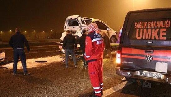 Ankara'da Yozgat'tan İstanbul'a giden şehirlerarası bir yolcu otobüsü, önce aynı yönde giden otomobile ardından da tuz yüklü TIR'a arkadan çarptı. Kazada, 1'i ağır 9 kişi yaralandı.