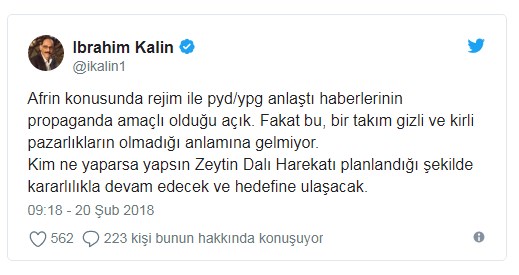 Cumhurbaşkanlığı Sözcüsü İbrahim Kalın sosyal medya hesabı üzerinden yaptığı açıklamada: "Bu haberlerin propaganda amaçlı olduğu açık. Bir takım gizli ve kirli pazarlıklar var. Kim ne yaparsa yapsın harekat hedefine ulaşacak" dedi.