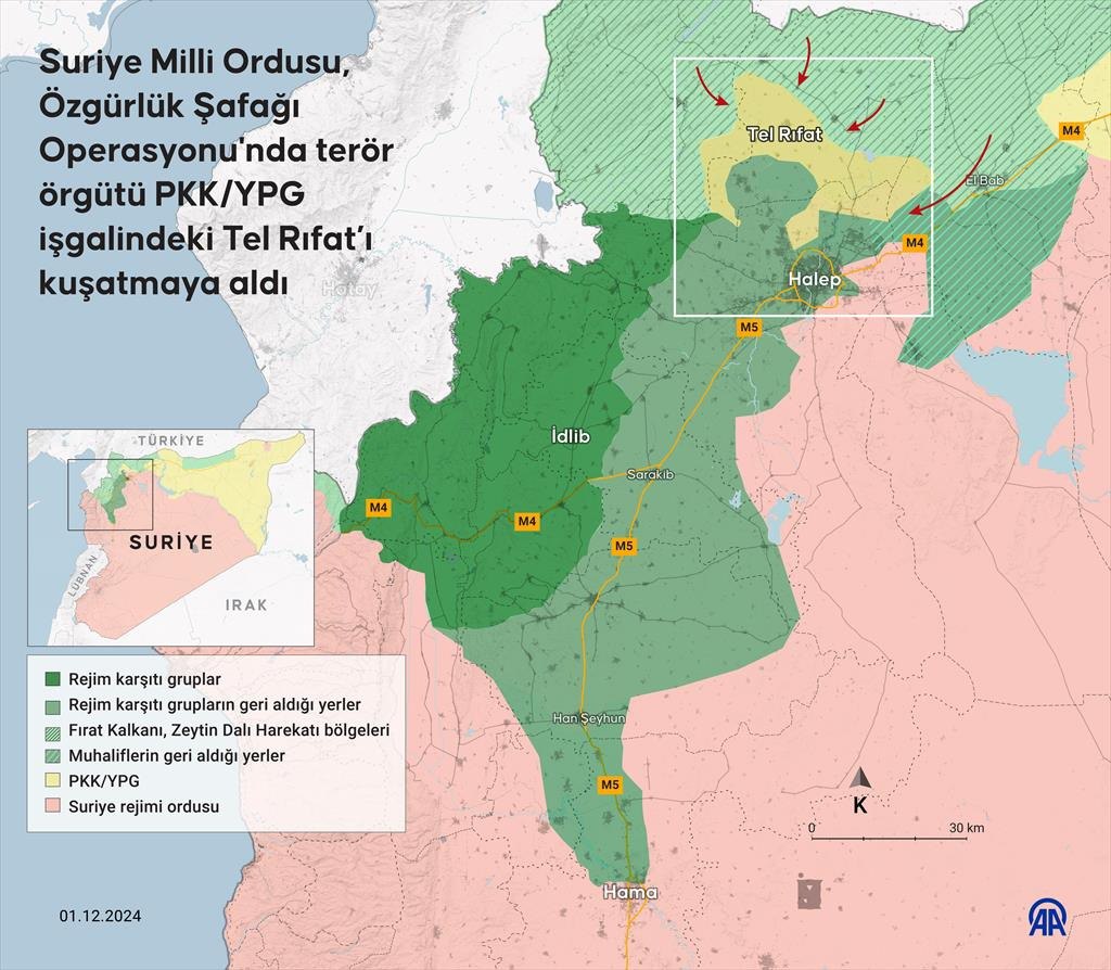 Suriye Milli Ordusu'nun (SMO) üst üste gerçekleştiridiği hamlelerle Suriye haritası anbean değişiyor. SMO güçleri, Halep ve İdlib'in ardından kuşatma altına aldıkları Tel Rıfat'ı da ele geçirdi. Milli ordunun Hama'ya ilerleyişi ise sürüyor. Hama'nın ele geçirilmesiyle Şam koridoru da açılacak.