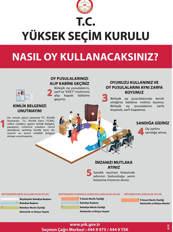 YSK’nın sitesinde nasıl oy kullanılacağına dair bir broşür de yayımlandı. Buna göre, 5 adımda oy verme işlemi şu şekilde olacak;