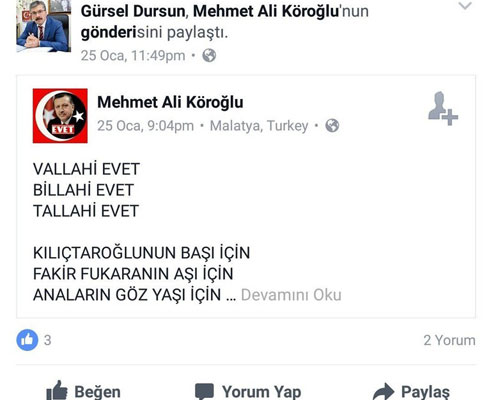 Yüksek Seçim Kurulu (YSK) Malatya İl Seçim Müdürü Gürsel Dursun’un, Facebook sayfasında paylaştığı, “Kılıçdaroğlu’nun başı için evet” mesajı üzerine idari soruşturma açıldı.
