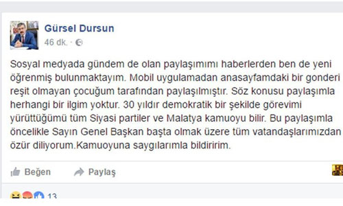 Bu arada Dursun, paylaşıma gelen tepkiler üzerine Facebook hesabından bir açıklama yaptı ve paylaşımı reşit olmayan çocuğunun yaptığını, kendisinin ilgisi olmadığını iddia etti. Dursun, başta Kemal Kılıçdaroğlu olmak üzere tüm vatandaşlardan özür dilediğini yazdı.