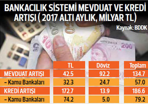 Kamu bankaları, yılın ilk altı ayındaki TL mevduat artışının yüzde 76’sını, toplam mevduatın ise yüzde 42’sini toplarken; TL kredilerdeki artışın yüzde 43’ünü, toplam kredilerdeki artışın da yüzde 42’sini veren taraf olmuş.