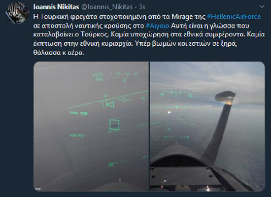 Ege Denizi üzerinde Türk savaş uçakları ve Yunan savaş uçakları arasında yaşanan karşılıklı taciz manevraları yeni bir boyuta taşındı. Yunan savaş uçağının denizde kendi halinde seyreden Türk savaş gemisine kilitlendiği ortaya çıktı.
