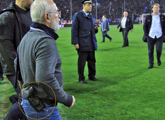 Bir ara ceketini de çıkaran Savvidis’in belinde silah olduğu görüldü. AEK takımı ise Savvidis’in hakeme "Sen ölüsün" deyip elini belindeki silaha götürdüğünü ileri sürdü.
