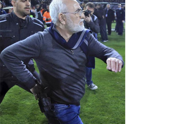 Yunanistan’da PAOK - AEK maçında ofsayt nedeniyle gol iptal edilince PAOK takımının başkanı belindeki silahla sahaya girdi. Tartışmanın büyümesi üzerine maç ertelendi.