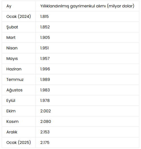 Türkiye Cumhuriyet Merkez Bankası (TCMB) tarafından açıklanan ocak ayı Ödemeler Dengesi verilerine göre, Ocak ayında Türklerin yurt dışından gayrimenkul alımları 144 milyon dolara ulaştı. Bu rakam, yıllık bazda 2 milyar 175 milyon dolara çıkarak yeni bir zirveye ulaştı.