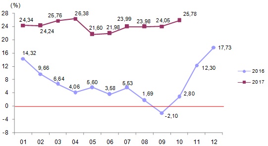 Ülke sınırları içinde üretimi yapılarak yurt dışına ihraç edilen malların üretici fiyatlarındaki değişimi ölçen yurt dışı üretici fiyat endeksi (YD-ÜFE), 2017 yılı Ekim ayında bir önceki aya göre yüzde 4,26, bir önceki yılın aralık ayına göre yüzde 13,82, bir önceki yılın aynı ayına göre yüzde 25,78 ve on iki aylık ortalamalara göre yüzde 22,71 artış gösterdi.