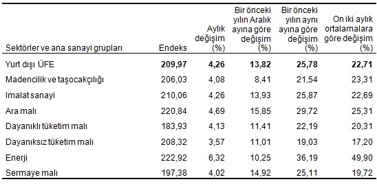 Sanayinin iki sektörünün bir önceki aya göre değişimleri; madencilik ve taşocakçılığı sektöründe yüzde 4,08 artış, imalat sanayi sektöründe ise yüzde 4,26 artış olarak gerçekleşti.