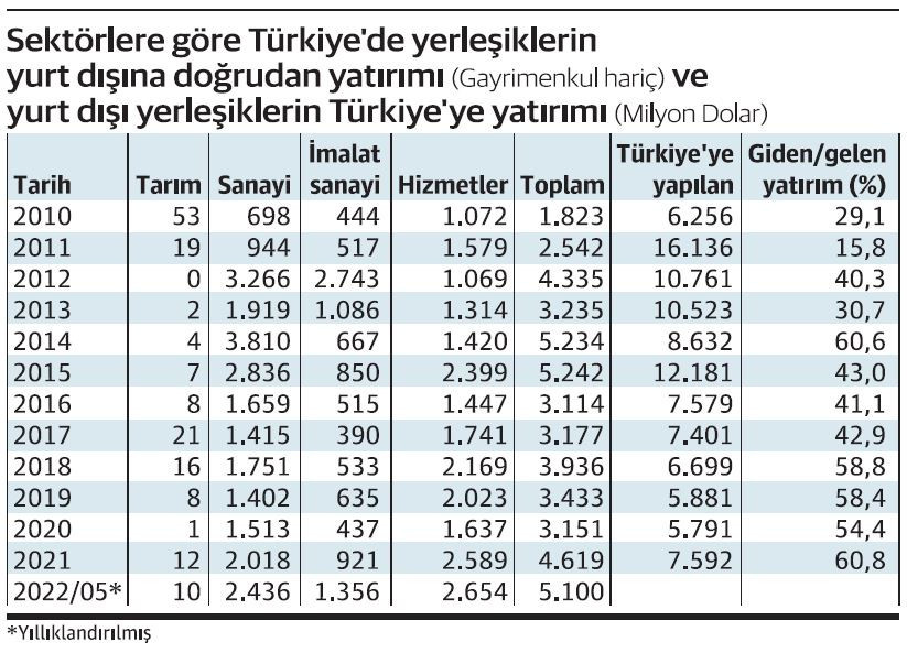 Türkiye’ye yapılan doğrudan yatırımlar yanında son dönemde Türkiye’den yurt dışına yapılan yatırımlarda da yüksek seviyelerdeki seyir sürüyor. 2022 itibariyle toplam yatırımlarda 5 milyar dolarlık seviyenin yeniden aşılması ihtimali belirdi. 2010’dan bu yana devam eden yıllık bazda yüksek seviyeler, toplamda bakıldığında ciddi sayılara ulaşmış durumda… Örneğin, 2010’dan 2021 sonuna kadar Türkiye’den yurt dışına yapılan doğrudan yatırımlar 43 milyar 841 milyon dolara ulaştı. Yapılan yatırımların 23,2 milyar doları sanayide oluşurken, 9.7 milyar doları da sanayinin içinde imalat sanayiinde yapıldı.