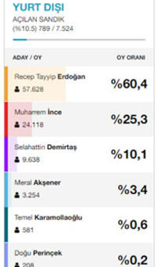 Suudi Arabistan'da ilk sonuçlara göre İnce 62.1 ile birinci çıkarken Erdoğan 35.3 oy aldı.