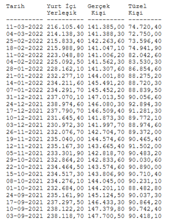 11 Mart haftasında gerçek kişilerin döviz mevduatları bir önceki haftaya göre 3,3 milyon dolar azalarak 141 milyar 385 milyon dolar, tüzel kişilerin döviz mevduatı 1,97 miyar dolar artarak 74 milyar 720,40 milyon dolar oldu.