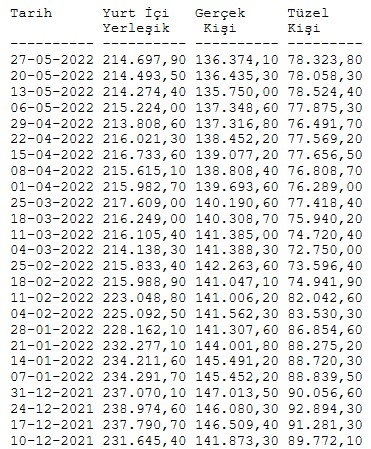 Türkiye Cumhuriyet Merkez Bankası(TCMB) tarafından açıklanan verilere göre, bir önceki hafta 214 milyar 493,5 milyon dolar olan yurt içi yerleşiklerin döviz mevduatı 27 Mayıs ile sona eren haftada 214 milyar 697,50 milyon dolara geldi.