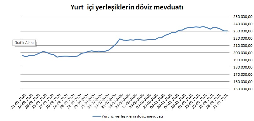 Türkiye Cumhuriyet Merkez Bankası (TCMB) tarafından açıklanan verilere göre, bir önceki hafta 230 milyar 424 milyon dolar olan yurt içi yerleşiklerin döviz mevduatı 12 Mart ile sona eren haftada 230 milyar 330,6 milyon dolara geldi.