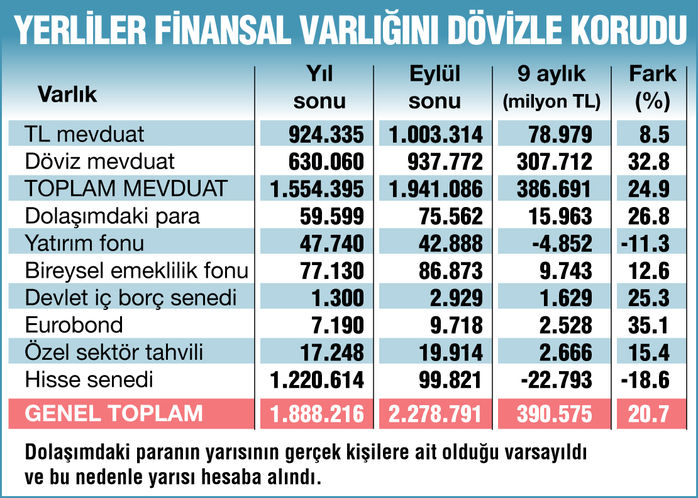 Bu artış sayesinde finansal varlıkların toplamı 2 trilyon 279 milyar liraya yükseldi. Yılbaşında 1 trilyon 888 milyar lira olan tasarruflarda 390.5 milyar liralık artışın yüzde 79’u kur farkından geliyor. Dövize yatırım bu anlamda amacına ulaştı. Fırtınalı havada koruyucu etkisini gösterdi.9 aylık dönemdeki tüketici enflasyonu yüzde 19.37 arttı. Yerleşiklerin toplam tasarruflarındaki artış da bitişikten görülebileceği gibi yüzde 20.7 düzeyinde. Az önce de belirttik bu artışın 307.7 milyarı veya yüzde 79’u kurların artışından kaynaklanıyor.