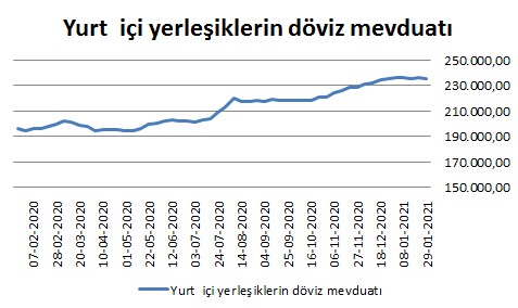 Türkiye Cumhuriyet Merkez Bankası (TCMB) tarafından açıklanan verilere göre, bir önceki hafta 236 milyar 106,9 milyon dolar olan yurt içi yerleşiklerin döviz mevduatı 29 Ocak ile sona eren haftada