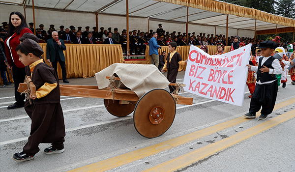 Öğrencilerin şiir okuduğu törende, Vali Ünlüer yaptığı konuşmada, Cumhuriyet'in yüzyıllardır özgürlük aşkıyla yoğrulmuş bir milletin kendi kaderine yön verme iradesinin adı olduğunu belirtti.