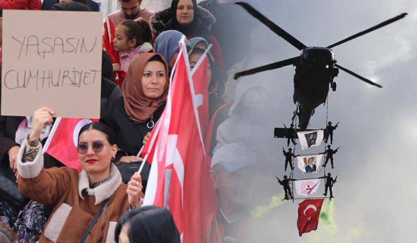 Tören sonunda ayrıca Jandarma Genel Komutanlığı'na bağlı uçuş gösteri timi, 'üzüm salkımı' gösterisi yaptı. Ankara'dan gelen özel ekibin Cumhuriyet Meydanı’nda yaptığı selamlama uçuşu, kutlamalara gelen vatandaşlar tarafından ilgiyle izlendi. Vatandaşlar, o anları cep telefonları ile kayıt altına aldı.