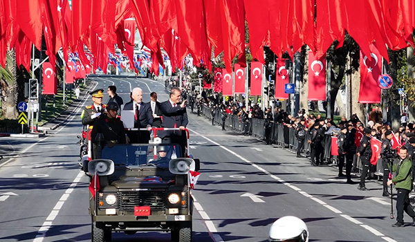 Adıyaman Valisi Osman Varol, Atatürk Bulvarı'nda Belediye Başkanı Abdurrahman Tutdere ile birlikte tören birliklerini ve vatandaşları selamladı.