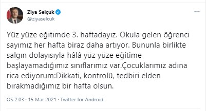 Milli Eğitim Bakanı Selçuk, kişisel Twitter hesabında yaptığı açıklamada 3 haftadır yüz yüze eğitime geçilen okullarda öğrenci sayısının her geçen gün arttığını belirtti.