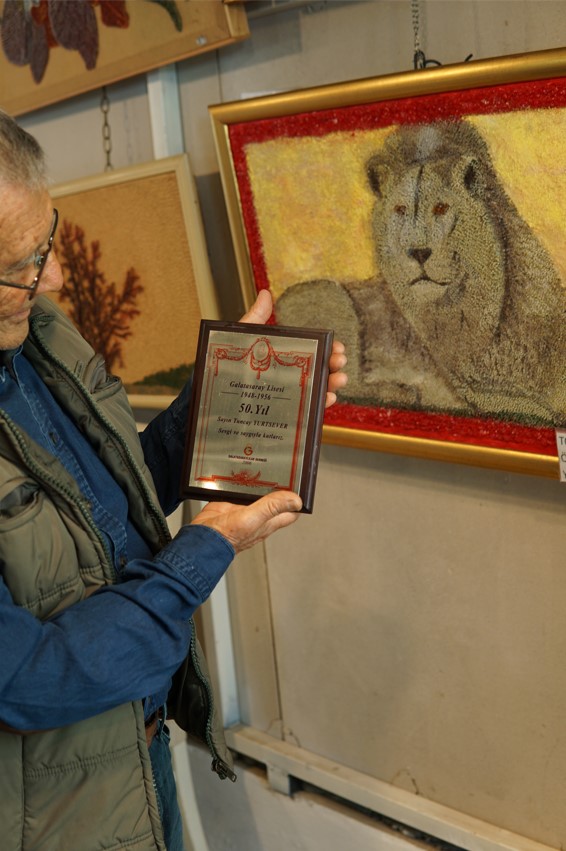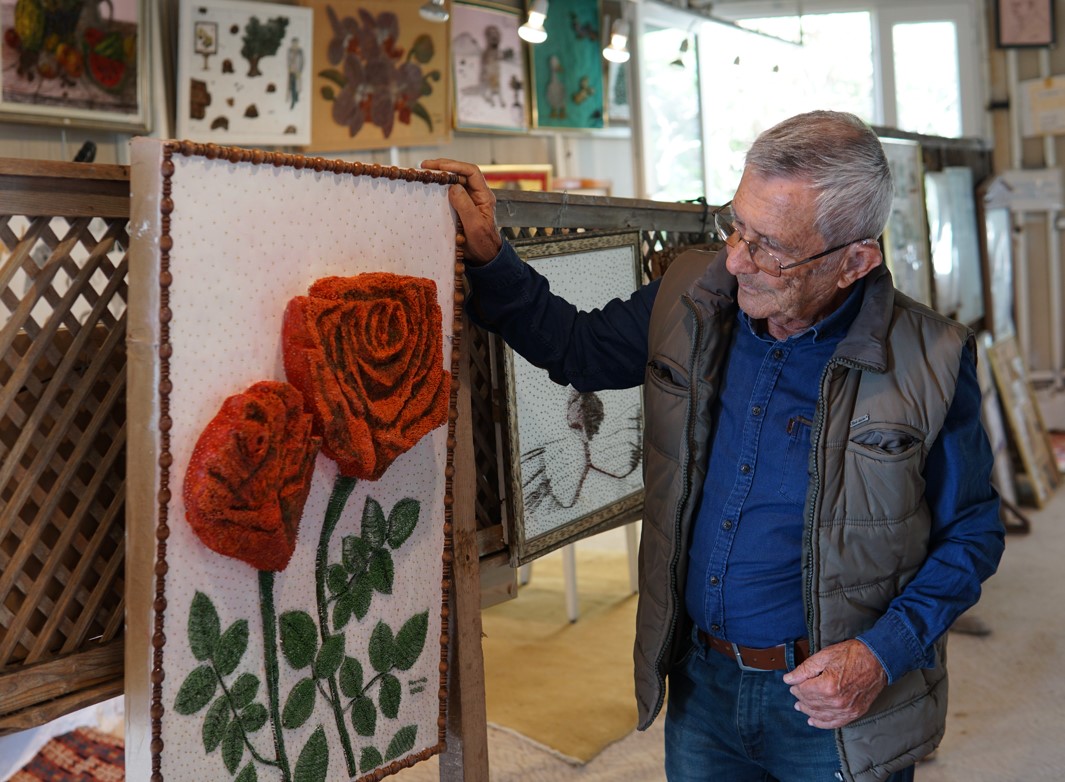 - Önce iğneleri strafora batırıyordum, sonra bunları boyamayı düşündüm. İğnelerle yapılmış bir tablonun üzerinde iğneleri boyamayı denedim fırçayla ama tablo berbat oldu. Onun üzerine iğneleri ayrıca boyamaya başladım. Özetle elli bin iğne ile yapılan bir tabloda iki kez iğneleri batırmam gerekti. Önce strafora batırıyorum rengarenk boyuyorum, sonra oradan boyanmış iğnelerden alıp tabloyu yapıyorum. Böyle başladı ve şu anda 70-80 tablom var. Galerim var. Çok sayıda sergim oldu ve çok karma sergiye katıldım. Yaptığım işin büyük ilgi görmesinin nedeni kullandığım malzemenin ilginçliği.