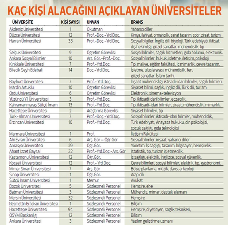 Kritik soru ise, üniversitelerin açılmasına az bir zaman kala, boşalan kadroların nasıl ve ne zaman doldurulacağı? Sorunun çözümü için de düğmeye basıldı. Son 15 gün içinde üniversiteler hem akademik hem de idari personel alımı için birer birer ilana çıkmaya başladı. Sadece Anadolu’da değil Marmara Üniversitesi, Hacettepe Üniversitesi gibi büyük şehirlerdeki üniversiteler de ihtiyaçları doğrultusunda personel alacak. Arananlar arasında kimler yok ki; profesörler, doçentler, araştırma görevlileri. Bunlar akademik personel. Bir de sözleşmeli alınacak olan idari ve destek personeli var. Hemşiresinden ebesine, güvenlik görevlisinden avukatına kadar her alanda üniversiteler, eleman arıyor.