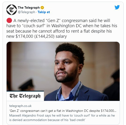 Demokrat Parti'nin Florida eyaleti 10. bölge milletvekili olarak Temsilciler Meclisi'ne giren ve Kongre'nin ilk Z kuşağı üyesi unvanını alan Maxwell Alejandro Frost, seçim kampanyasına harcadığı paralar yüzünden borç içinde yüzdüğünden, kira fiyatlarının ABD ortalamasının üzerinde seyrettiği başkentte ev tutamadı.
