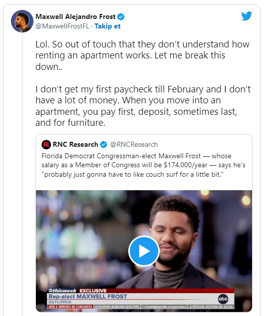 Sputnik'teki habere göre; İlk dönem milletvekili olarak 174 bin dolarlık yıllık maaş alacak olan Frost, konut sorununun kronikleştiği ve stüdyo dairelerin bile ABD ortalamasının yaklaşık 450 dolar üzerinde 1275 dolara kiralandığı Washington DC'de kiraların ucuz olmamasından yakındı.
