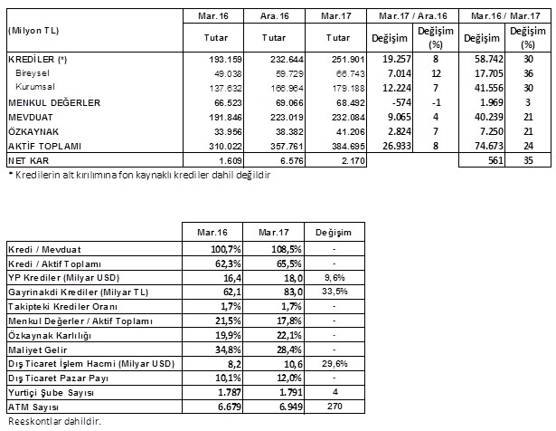 2017 yılının ilk çeyreğinde nakdi kredilerimiz, %8’in üzerinde büyüme kaydederek 252 milyar TL’ye ulaştı. Bu kredi büyüme hızı, yıllık bazda yaklaşık %40 oranında bir büyümeye karşılık gelmektedir. Bu dönemde, bireysel ve girişimci müşterilerimize kullandırdığımız krediler sırasıyla %12 ve %11 oranlarında artış kaydetmiş bulunuyor. Bunlar da %50’nin üzerinde yıllık bir büyüme hızına işaret etmektedir.
