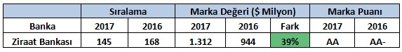 Bağımsız marka değerleme ve strateji danışmanlık şirketi Brand Finance’in “Dünyanın En Değerli 500 Banka Markası-2017” araştırması sonuçlarına göre Ziraat Bankası bir önceki yıla göre sıralamada 23 basamak birden yükselerek Türkiye’nin marka değeri en çok yükselen banka markası oldu. Marka değerini 944 milyon dolardan 1.312 milyar dolara yüzde 39 arttıran Ziraat Bankası, Türkiye’deki bankalar arasında marka değerini en fazla artıran banka olurken araştırmada bir önceki yıla göre sıralamasını yükselten tek banka Ziraat Bankası oldu.