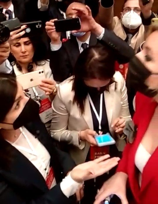 Tarihi zirveye dair açıklama yapmak üzere basın mensuplarıyla bir araya gelen Zaharova, bu esnada çarpıcı görüntülere imza attı. Açıklama yapmak üzere salona giriş yapan Zaharova ilk olarak, "Salonda Ukraynalı gazeteci var mı?" sorusunu yöneltti.