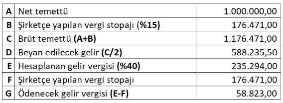 Kanunu’na göre; tam mükellef kurumlardan elde edilen kâr paylarının yarısı gelir vergisinden istisna olup “istisna edilen tutar dâhil toplam temettü” üzerinden şirketçe yapılan stopajın tamamı, beyan edilen temettü üzerinden hesaplanan vergiden mahsup edilir. (G.V.K. madde 22/2)